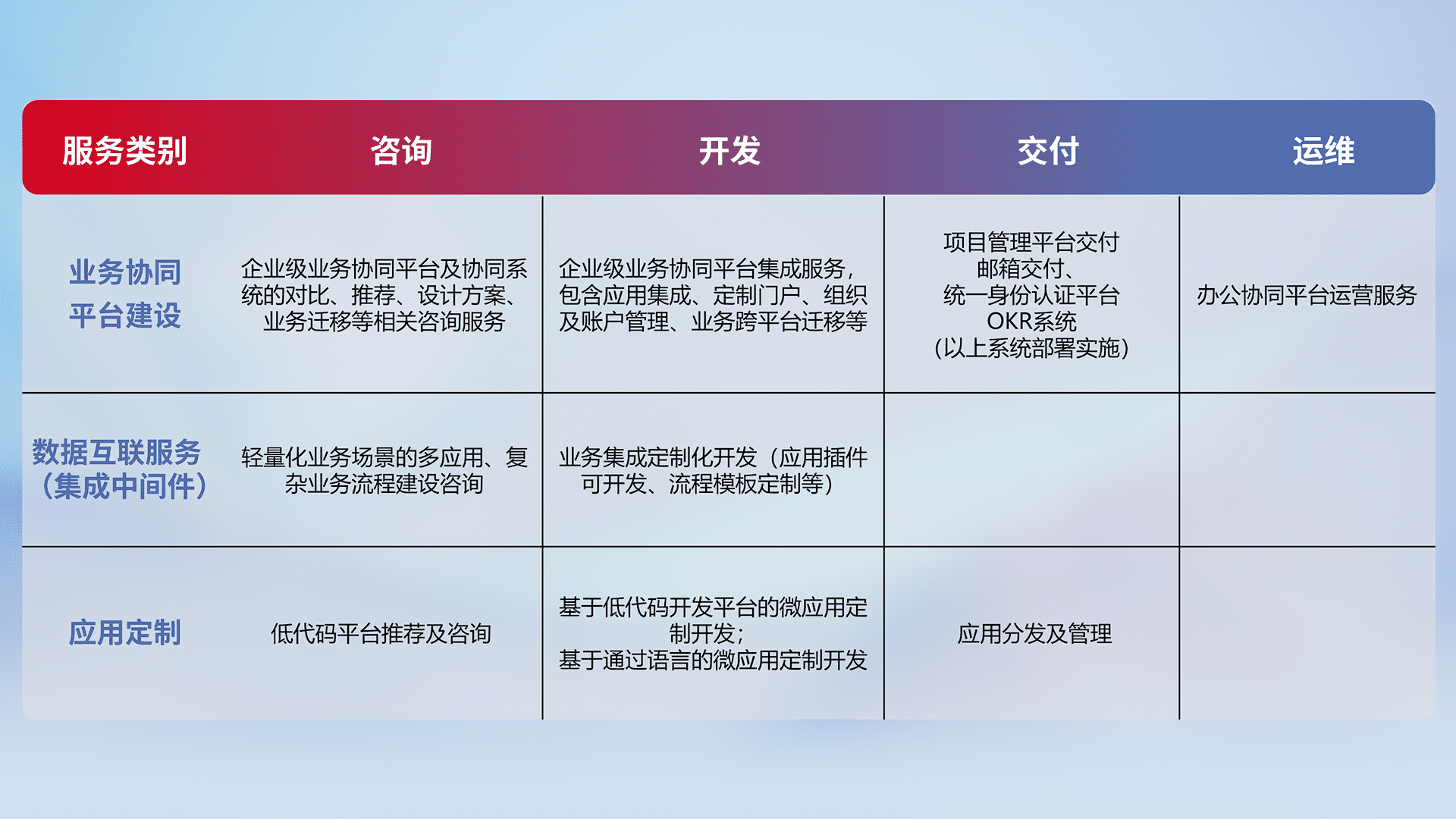 针对钉钉、、、、企微、、、、IDaas等平台级产品提供产品的规划、、、、方案、、交付、、、定制化开发等服务,,,,实现如统一协同办公、、、、智能客户服务、、、混合会议管理、、、、智能数据查询、、等业务场景,,,实现数字化转型。。